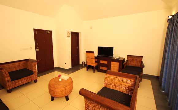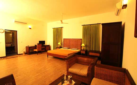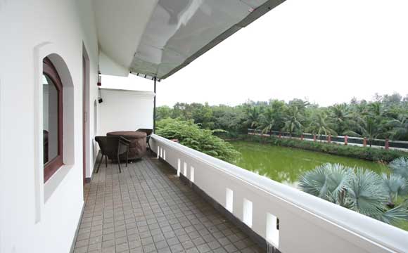 Номер люкс с кондиционером, просторный и уютный номер с зоной отдыха, балконом с видом на пруд и растительность.