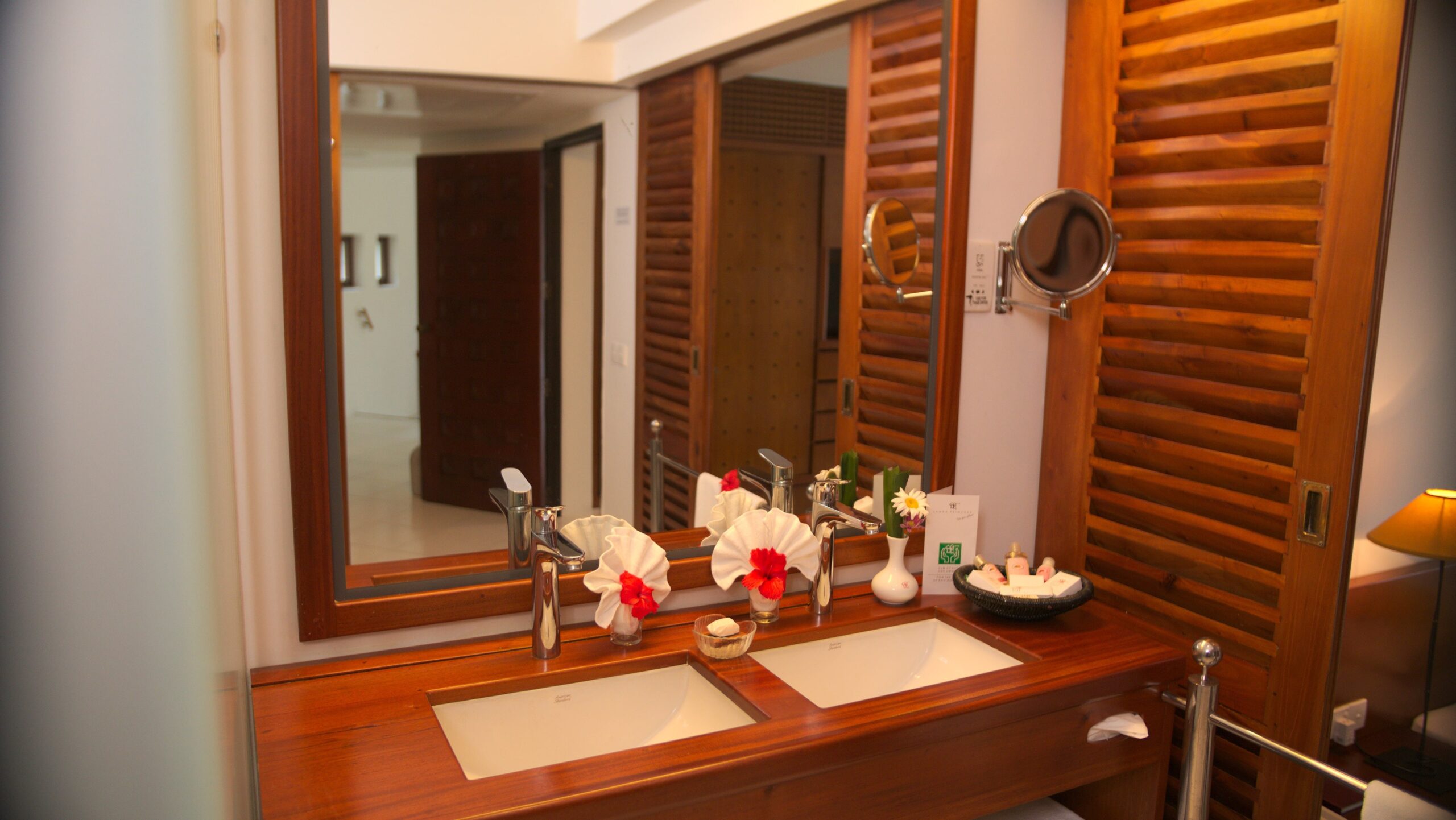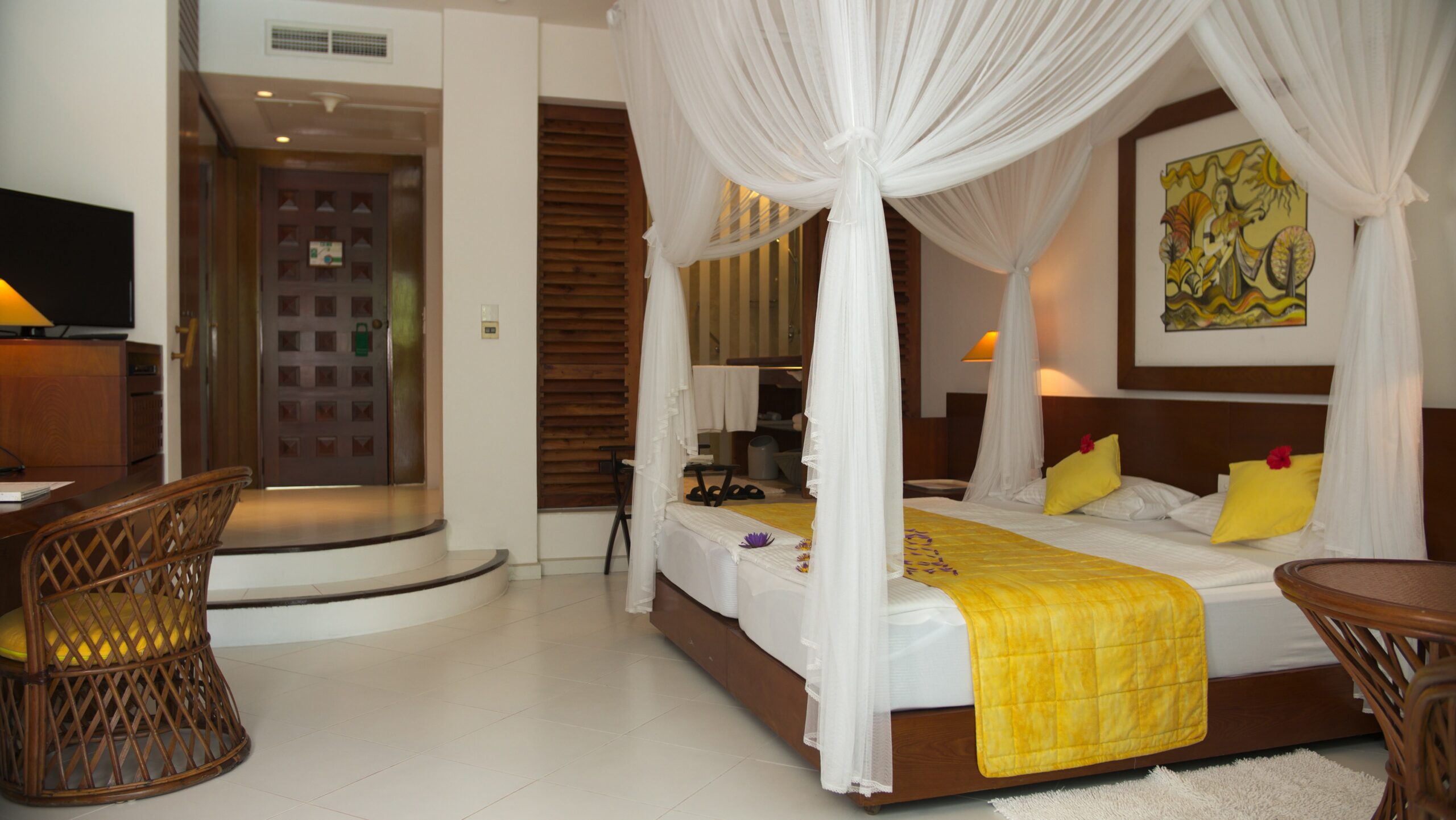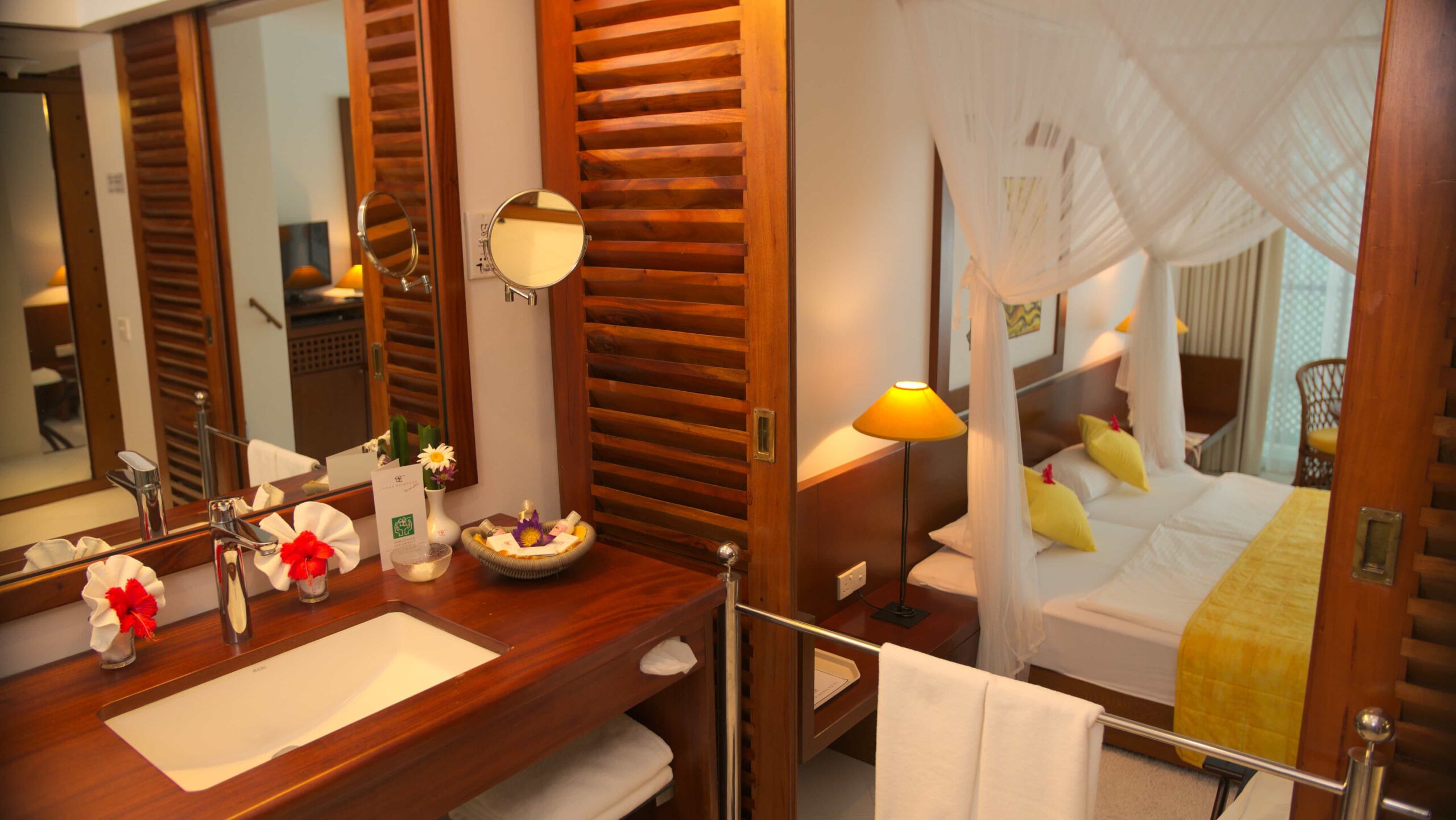 Очень просторный (около 45 м²) двухместный номер, дружелюбно и комфортно оборудованный. Две односпальные кровати с балдахином для москитной сетки, сиденья. Большая душевая кабина с тропическим душем, косметическое зеркало, фен, отдельный туалет с биде, халат, тапочки. Большой балкон или терраса с мебелью и шезлонгом, с видом на море и бассейн, окруженный пальмовым садом. Дополнительные удобства в этих номерах включают чайник для приготовления кофе и чая, а также DVD-плеер. Видео доступны бесплатно на стойке регистрации отеля.