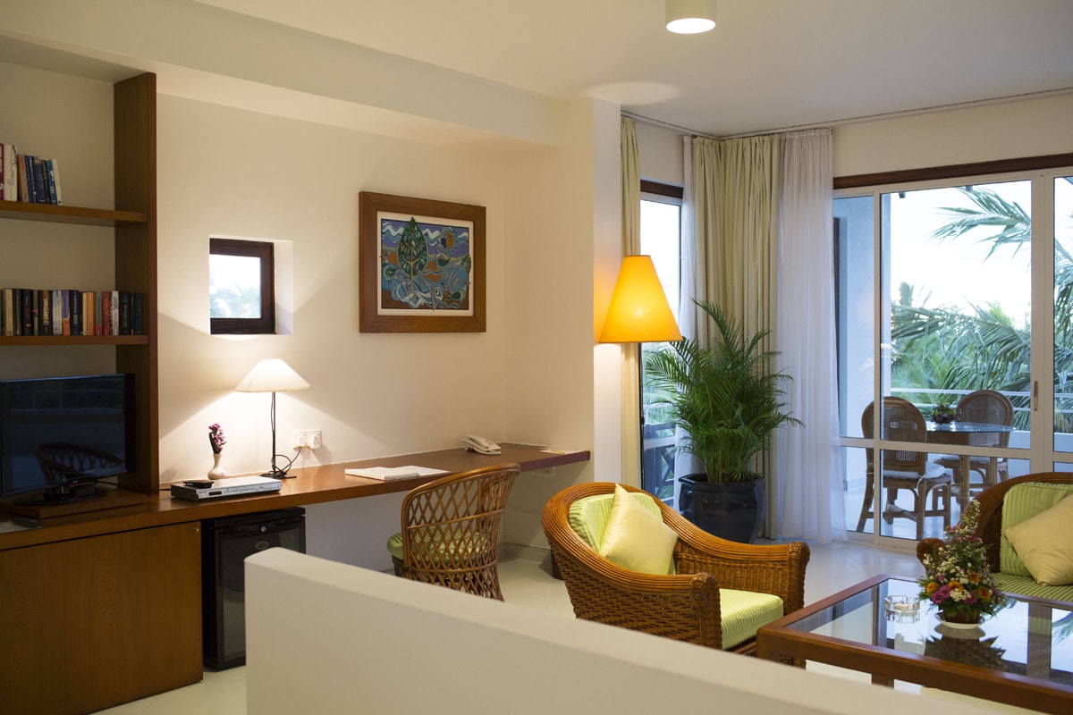 Просторные сьюты имеют жилую площадь около 90 м². Благодаря разделению на гостиную и отдельную спальню с очень просторным гардеробом, вы сможете насладиться особым уровнем комфорта. В гостиной гостиный уголок, письменный стол, телевизор с плоским экраном, плита для приготовления кофе и чая, DVD-плеер (видеофильмы можно бесплатно получить на стойке регистрации отеля). Спальная зона с двумя односпальными кроватями и балдахином для москитной сетки, дополнительный телевизор с плоским экраном. Душевая кабина с тропическим душем, косметическое зеркало, фен, отдельный туалет с биде, халат, тапочки. Из обеих комнат сьюта выход на большой балкон с мягкой мебелью для раннего утреннего кофе или принятия солнечных ванн, шезлонги с подушками и зонтиком. Балкон со стороны моря, с видом на бассейн и пальмовый сад. Размещение 2 или 3 взрослых. Правильное место для отдыха и наслаждения в приватной атмосфере.